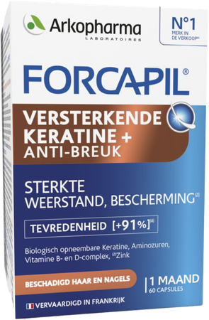Forcapil Keratine+ Caps 60 is een voedingssupplement, verkrijgbaar in uw buurtapotheek of online apotheek. Neem niet meer dan de aanbevolen dagelijkse dosis vermeld op de verpakking. Het vervangt geen gezonde levensstijl en gevarieerde en evenwichtige voeding. Vraag raad aan uw apotheker. Het product altijd buiten het bereik van kinderen houden.