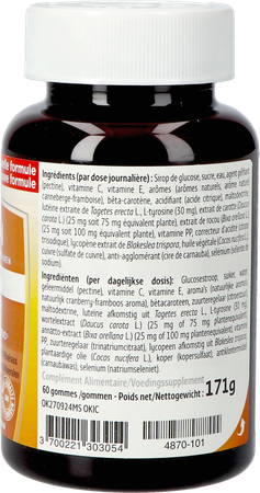 INGREDIËNTEN (per dagelijkse dosis): glucosestroop, suiker, water, geleermiddel (pectine), vitamine C, vitamine E, aroma's (natuurlijke aroma's, natuurlijk cranberry-framboos aroma), bètacaroteen, zuurteregelaar (citroenzuur), maltodextrine, luteïne afkomstig uit Tagetes erecta L., L-tyrosine (30 mg), wortelextract (Daucus carota L.) (25 mg of 75 mg plantenequivalent), annatto-extract (Bixa orellana L.) (25 mg of 100 mg plantenequivalent), vitamine PP, zuurteregelaar (trinatriumcitraat), lycopeen a‑omstig uit Blakeslea trispora, plantaardige olie (Cocos nucifera L.), koper (kopersulfaat), antiklontermiddel (carnaubawas), selenium (natriumseleniet).