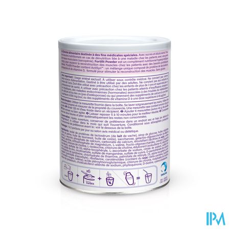 Voeding voor medisch gebruik. Met suikers en zoetstoffen. Dieetvoeding bij patiënten met ziektegerelateerde ondervoeding met spierverlies (sarcopenie). FortiFit® Powder is een eiwitrijke dieetvoeding ontwikkeld om spierherstel in patiënten met een verhoogde eiwitbehoefte te ondersteunen. Het bevat ActiSyn™: een unieke gepatenteerde mix van 100% wei-eiwit, extra leucine en vitamine D, ontwikkeld om de spiereiwitsynthese te stimuleren.
