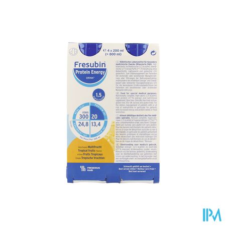Fresubin Protein Energy Drink 200ml Fruits Tropicaux/tropische Vruchten is een voedingssupplement, verkrijgbaar in uw buurtapotheek of online apotheek. Neem niet meer dan de aanbevolen dagelijkse dosis vermeld op de verpakking. Het vervangt geen gezonde levensstijl en gevarieerde en evenwichtige voeding. Vraag raad aan uw apotheker. Het product altijd buiten het bereik van kinderen houden.