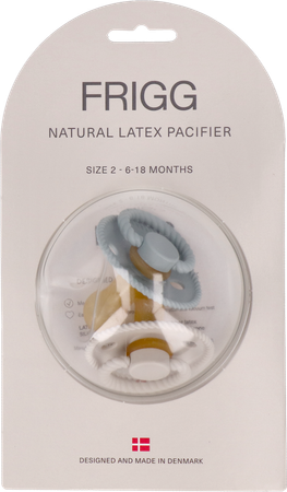 De Frigg fopspeen bestaat uit een latex speen met een gebogen schild.