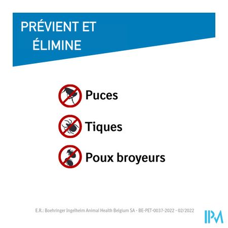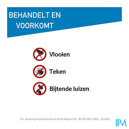 - Tegen infestaties met vlooien, alleen of in combinatie met teken en/of bijtende luizen.