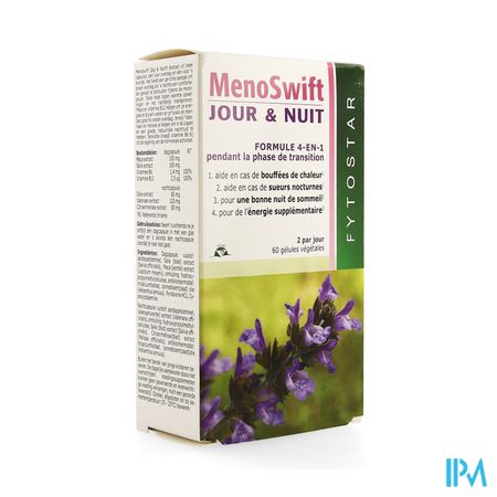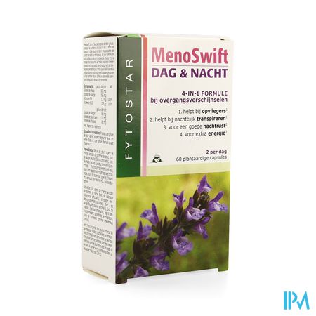 Fytostar Meno-swift Dag&nacht Caps 60 is een voedingssupplement, verkrijgbaar in uw buurtapotheek of online apotheek. Neem niet meer dan de aanbevolen dagelijkse dosis vermeld op de verpakking. Het vervangt geen gezonde levensstijl en gevarieerde en evenwichtige voeding. Vraag raad aan uw apotheker. Het product altijd buiten het bereik van kinderen houden.