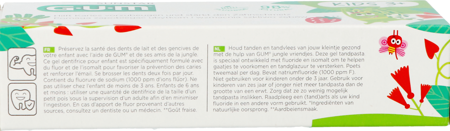 De GUM KIDS tandpasta bevat 1000 ppm (0,22% natriumfluoride) fluoride.