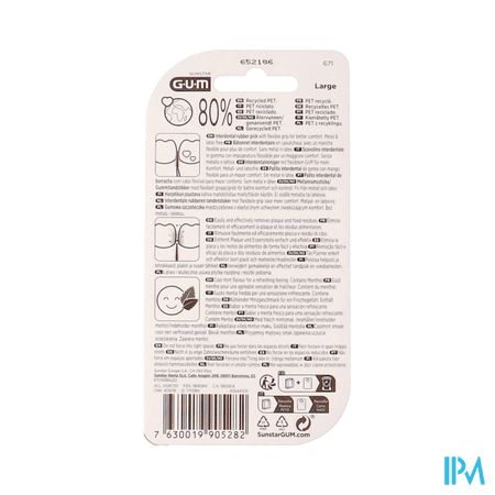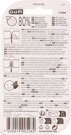 Interdentale reiniging is essentieel voor het behoud van gezond tandvlees en gebit en draagt bij aan volledige zelfzorg. Onze rubberen interdentale microborstels helpen je zacht en effectief schoon te maken waar een tandenborstel alleen dat niet kan. Met een koele muntsmaak laat GUM SOFT-PICKS MINTY LARGE je genieten van een frisse, muntachtige bries en helpt het voedselresten en tandplak tussen je tanden te verwijderen dankzij de zachte rubberen borstelharen en flexibele hals. Deze microborstel is gebruiksvriendelijk en biedt superieur tandvlees- en tandcomfort, en masseert zelfs je tandvlees. Het is ontworpen zonder latex, hout of metaal voor veilig en zacht gebruik.