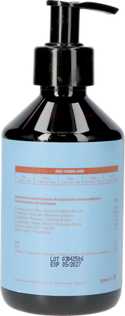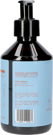 Onze 100% pure Sardineolie zit boordevol Omega-3 vetzuren (EPA & DHA) die bijdragen aan een glanzende vacht, gezonde huid, soepele gewrichten en een sterk immuunsysteem. Geen toevoegingen, geen vulstoffen – alleen zuivere kracht uit de zee.