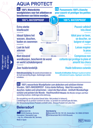 - Het flexibele, waterdichte materiaal beschermt de wond volledig tegen water tijdens het zwemmen, douchen of baden.