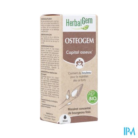 Herbalgem Osteogem Bio 30ml is een voedingssupplement, verkrijgbaar in uw buurtapotheek of online apotheek. Neem niet meer dan de aanbevolen dagelijkse dosis vermeld op de verpakking. Het vervangt geen gezonde levensstijl en gevarieerde en evenwichtige voeding. Vraag raad aan uw apotheker. Het product altijd buiten het bereik van kinderen houden.