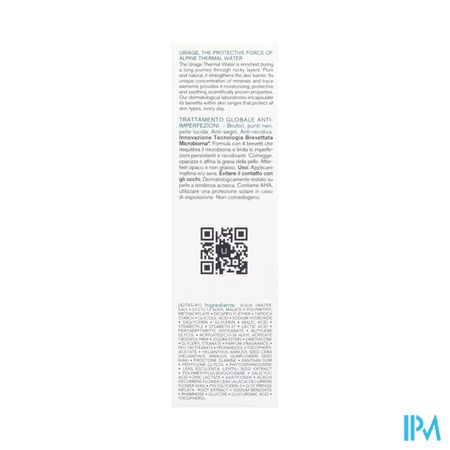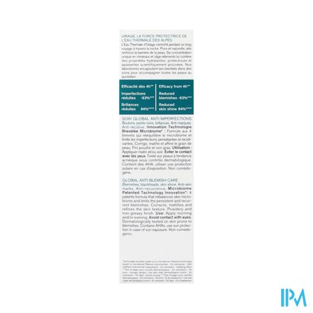 Deze globale verzorging tegen onzuiverheden combineert de gepatenteerde MICROBIOME-TECHNOLOGIE met URIAGE THERMAAL WATER, SALICYLZUUR, AHA's en ZINK om het acnemicrobioom weer in balans te brengen en hardnekkige en terugkerende onzuiverheden te beperken: