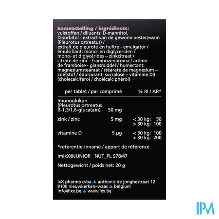 Imixx Junior Framboos Kauwtabl 30 is een voedingssupplement, verkrijgbaar in uw buurtapotheek of online apotheek. Neem niet meer dan de aanbevolen dagelijkse dosis vermeld op de verpakking. Het vervangt geen gezonde levensstijl en gevarieerde en evenwichtige voeding. Vraag raad aan uw apotheker. Het product altijd buiten het bereik van kinderen houden.