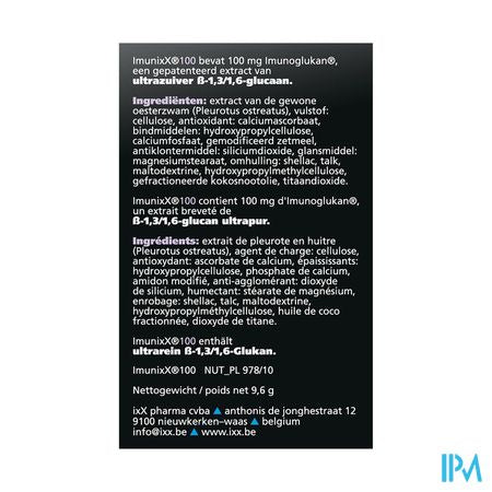 Imunixx 100 Tabl 90x320mg is een voedingssupplement, verkrijgbaar in uw buurtapotheek of online apotheek. Neem niet meer dan de aanbevolen dagelijkse dosis vermeld op de verpakking. Het vervangt geen gezonde levensstijl en gevarieerde en evenwichtige voeding. Vraag raad aan uw apotheker. Het product altijd buiten het bereik van kinderen houden.