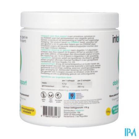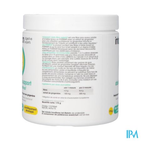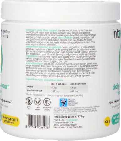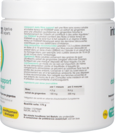 Intoleran Daily Fibre Support 175g is een voedingssupplement, verkrijgbaar in uw buurtapotheek of online apotheek. Neem niet meer dan de aanbevolen dagelijkse dosis vermeld op de verpakking. Het vervangt geen gezonde levensstijl en gevarieerde en evenwichtige voeding. Vraag raad aan uw apotheker. Het product altijd buiten het bereik van kinderen houden.