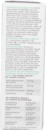 Ingrediënten per kruidenmix capsule:Munt extract 170 mg (mentha x piperita L.), gember extract 150 mg (zingiber officinale rhizome), koriander 100 mg (coriandrum sativum L.), stabilisator: capsule (HPMC), l-glutamine 50 mg, antiklontermiddel (silica).