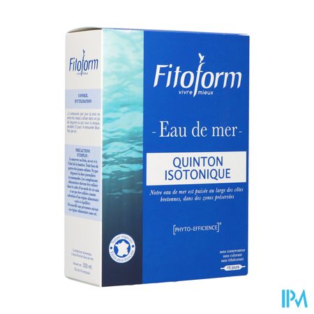Fitoform's O'marine is gegarandeerd 100% zeewater onttrokken uit Bretagne, onverwarmd, niet-bestraald, 100% natuurlijk. Bevat de 92 elementen van het schilderij van Mendeleiv. Quinton's originele formule.