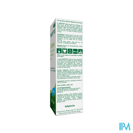 De Kalip'tus® Lotion, op basis van 12 Essentiële Oliën, verzacht de luchtwegen en zorgt voor een vrije ademhaling. De Kalip'tus Lotion kan in een verstuiver gebruikt worden of simpelweg op een zakdoek of op kleren.