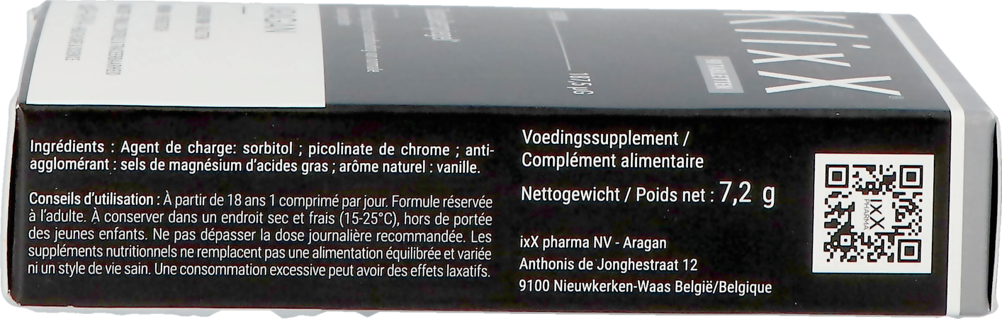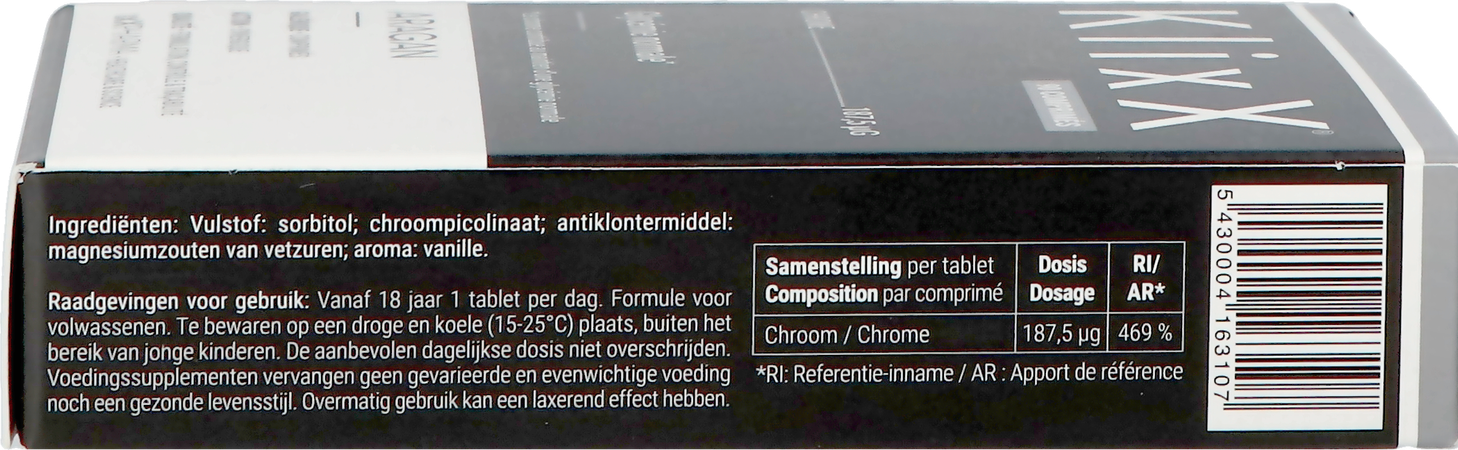 KlixX bevat per tablet 187,5 µg chroom (470% RI), onder vorm van chroompicolinaat.