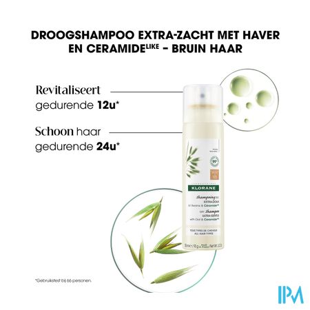 De Getinte droogshampoo van Klorane combineert verzachtende haver en beschermende Ceramideᴸᴵᴷᴱ met ultra-absorberende poedersoorten en pigmenten van natuurlijke oorsprong in een spray die geen witte sporen achterlaat op kastanjebruin tot donkerbruin haar. De extrazachte formule absorbeert overtollig talg en maakt het haar op milde wijze schoon. Deze praktische droogshampoo verfrist, beschermt en revitaliseert 12 uur lang*, en dat slechts in 2 minuten tijd. Zo kunt u bovendien ook de shampoobeurten spreiden. Gegarandeerd residu-vrij. Geschikt voor het haar van mannen en vrouwen.