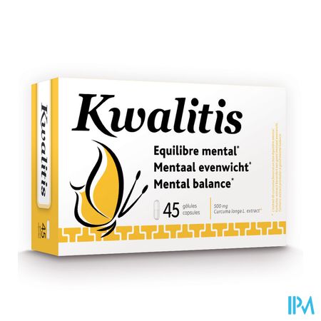 Kwalitis verkrijgbaar onder de vorm van capsules, bevat 500 mg kurkuma-extract (Curcuma longa L.) BCM-95® ter bevordering van een goed geestelijk evenwicht.