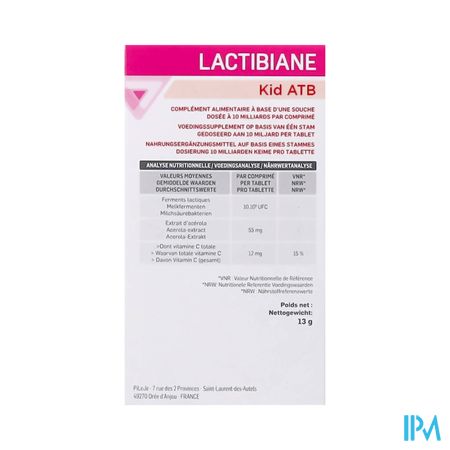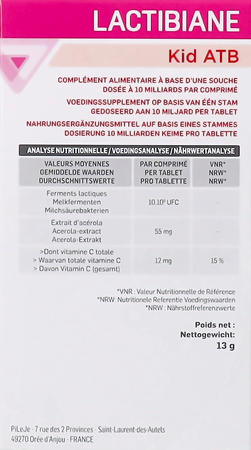 Lactibiane Kid Atb Kauwtabl 10 is een voedingssupplement, verkrijgbaar in uw buurtapotheek of online apotheek. Neem niet meer dan de aanbevolen dagelijkse dosis vermeld op de verpakking. Het vervangt geen gezonde levensstijl en gevarieerde en evenwichtige voeding. Vraag raad aan uw apotheker. Het product altijd buiten het bereik van kinderen houden.