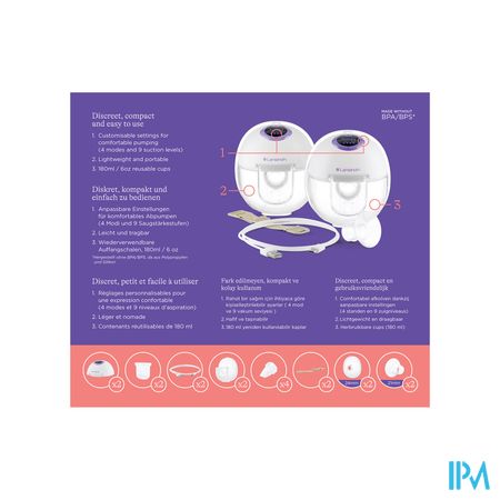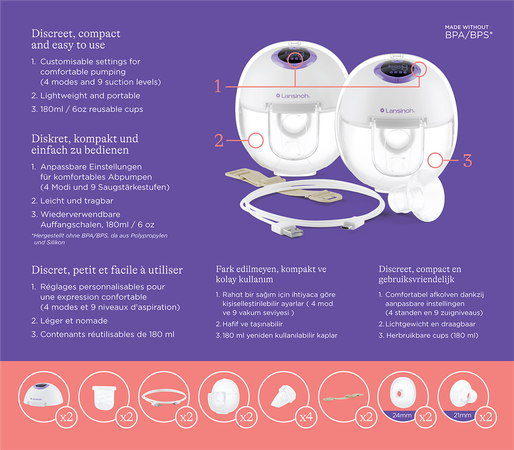 • Melkcup van 180 ml: praktisch en ergonomisch ontwerp om het verzamelen en overbrengen van moedermelk te vergemakkelijken. Eenvoudige montage en overgieten van melk.
