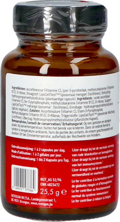 LIP-O-FERRO bevat liposomaal ijzer van de nieuwste generatie. De voordelen van een liposomaal ijzersupplement zijn tweeledig. De liposomale technologie zorgt ervoor dat het ijzer veel beter in de cellen wordt opgenomen. Het andere grote voordeel is dat ingesloten zijn in de vette liposoombolletjes betekent dat het ijzer de maag of het darmkanaal niet nadelig beïnvloedt. Dit vermijdt de vaak voorkomende bijwerkingen van ijzersupplementen zoals misselijkheid en obstipatie. Vitamine C in deze formule zorgt ervoor dat de ijzerabsorptie verbeterd wordt. Vitamine B 12 is toegevoegd omdat het ook belangrijk is voor de vorming van rode bloedcellen. Dit product bevat een actieve vitamine B 12, methylcobalamine. Het supplement is ook belangrijk voor het energiemetabolisme en kan verder helpen om vermoeidheid te verminderen