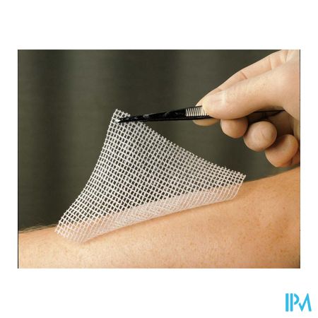 Gebruiksklare roostertule, geïmpregneerd met witte vaseline, voor behoedzame verzorging van oppervlakkige wonden.