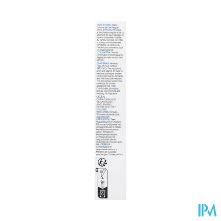 De Hyalu B5 oogcrème van La Roche-Posay is een anti-rimpel dermocosmetische verzorging voor de oogcontouren. Deze oogcrème herstelt de gevoelige huid rond de ogen en geeft volume door de werking van een duo van hyaluronzuren en vitamine B5. Gefragmenteerd hyaluronzuur en hyaluronzuur met een hoog moleculair gewicht werken in synergie om de huid zowel aan het oppervlak als intens te vullen. Verder heeft Vitamine B5 een kalmerende en herstellende werking. Rimpels verminderen, de huid rondom de ogen toont meer elasticiteit en volume. Daarnaast wordt ook de huidbarrière hersteld. De parfumvrije formule is uiterst geschikt voor een gevoelige huid rondom de ogen. De lichtreflecterende pigmenten lichten de vermoeide, doffe huid rondom de ogen op. De textuur van de Hyalu B5 oogcrème is comfortabel en trekt snel in.