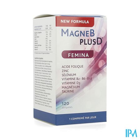 MagneBplusD Femina Tabl 120 Nf is een voedingssupplement, verkrijgbaar in uw buurtapotheek of online apotheek. Neem niet meer dan de aanbevolen dagelijkse dosis vermeld op de verpakking. Het vervangt geen gezonde levensstijl en gevarieerde en evenwichtige voeding. Vraag raad aan uw apotheker. Het product altijd buiten het bereik van kinderen houden.