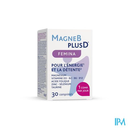 MagneBplusD Femina 30 Tabl is een voedingssupplement, verkrijgbaar in uw buurtapotheek of online apotheek. Aanbevolen dagelijkse dosis niet overschrijden. Buiten het bereik van jonge kinderen houden. Voedingssupplementen mogen niet als vervanging voor een gevarieerde en evenwichtige voeding en van een gezonde levensstijl worden gebruikt. Kinderen, zwangere vrouwen en vrouwen die borstvoeding geven, raadpleeg voor gebruik uw apotheker. Informeer bij gelijktijdige inname van geneesmiddelen. Geen langdurig gebruik zonder deskundig advies.