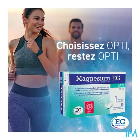 Magnesium Opti EG is een filmomhulde tablet die 225 mg magnesium, alsook vitamine B6 bevat.