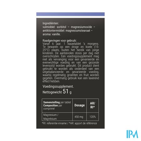 Dit Magnesium supplement, nu onder vorm van een kauwtablet met breuklijn, bevat 450 mg elementair magnesium onder de vorm van magnesiumoxide.
