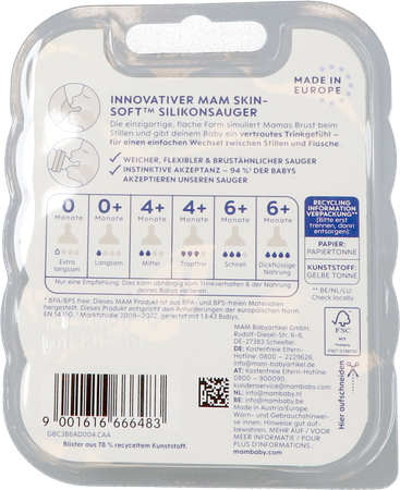- MAM SkinSoftTM Silicone: snel geaccepteerd door baby's – voor een vertrouwd gevoel