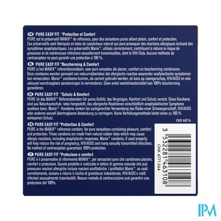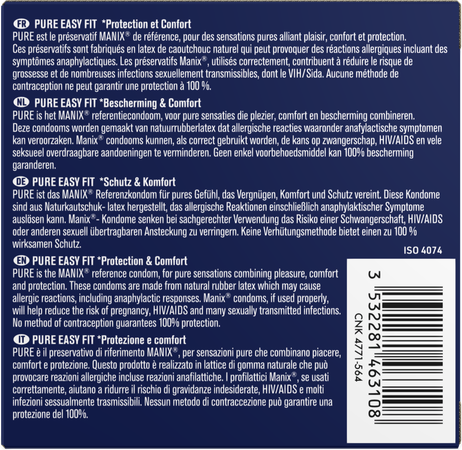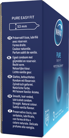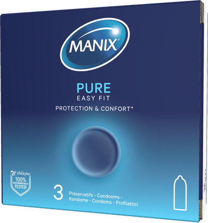 PURE is het MANIX referentiecondoom, voor pure sensaties die plezier, comfort en bescherming combineren. Deze condooms worden gemaakt van natuurrubberlatex dat allergische reacties waaronder anafylactische symptomen kan veroorzaken. Manix condooms kunnen, als correct gebruikt worden, de kans op zwangerschap, HIV/AIDS en vele seksueel overdraagbare aandoeningen te verminderen. Geen enkel voorbehoudsmiddel kan 100% bescherming garanderen.