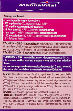 VITAMINE C + ZINK – kauwtabletten van Mannavital combineren met zink, vitamine C en selenium drie cruciale voedingsstoffen die ons helpen beschermen tegen winterse invloeden omdat ze bijdragen tot een sterke weerstand en tot de bescherming tegen schadelijke vrije radicalen . Bijzonder aan deze tabletten is het feit dat ze ook een sterk geconcentreerd extract van vlierbessen bevatten die tegelijk de immuniteit ondersteunen en de keel tot rust te brengen. VITAMINE C + ZINK – kauwtabletten met vlierbesextract zijn vrij van geraffineerde suiker en zijn gezoet met het steviolglycosiden en de suikeralcoholen mannitol en xylitol. Ze bevatten als smaakstof een natuurlijk woudvruchtenaroma. Deze kauwtabletten combineren uitzonderlijk goed met VITAMINE D3 + VITAMINE A Forte en met QUERCETINE PLATINUM
