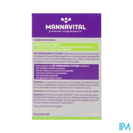 Mannavital Ashwagandha V-caps 60 is een voedingssupplement, verkrijgbaar in uw buurtapotheek of online apotheek. Neem niet meer dan de aanbevolen dagelijkse dosis vermeld op de verpakking. Het vervangt geen gezonde levensstijl en gevarieerde en evenwichtige voeding. Vraag raad aan uw apotheker. Het product altijd buiten het bereik van kinderen houden.