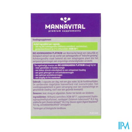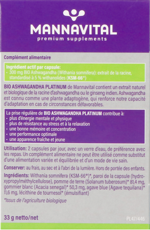 Ashwagandha of Indiase ginseng is een wortel die vooral de stressbestendigheid verhoogt en helpt tot rust te komen. Hierdoor komt meer energie vrij om beter te presteren in werk en sport. Opmerkelijk is ook de mentale boost die men krijgt met beter emotioneel functioneren en een beter geheugen- en concentratievermogen. Tevens wordt het seksueel functioneren ondersteund en blijft men jong van geest en lichaam. ASHWAGANDHA PLATINUM van Mannavital bevat een biologisch totaalextract van de wortel, dat als KSM-66® zijn werking in minstens 13 correct uitgevoerde klinische studies heeft aangetoond.