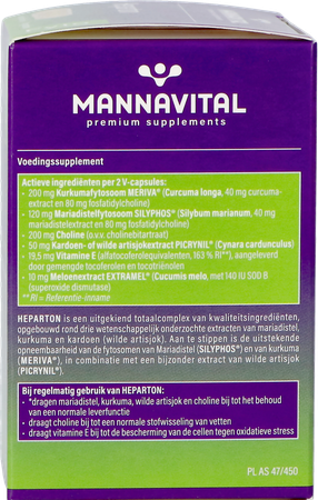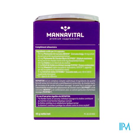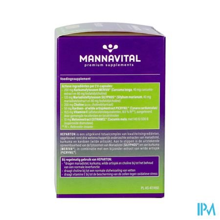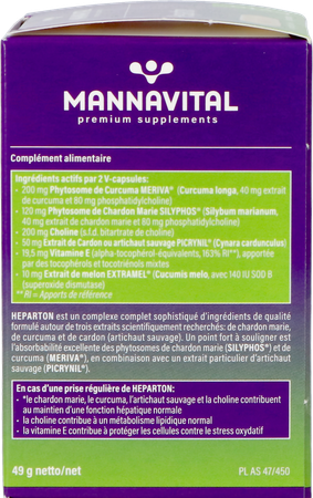 Mannavital Heparton V-caps 60 is een voedingssupplement, verkrijgbaar in uw buurtapotheek of online apotheek. Neem niet meer dan de aanbevolen dagelijkse dosis vermeld op de verpakking. Het vervangt geen gezonde levensstijl en gevarieerde en evenwichtige voeding. Vraag raad aan uw apotheker. Het product altijd buiten het bereik van kinderen houden.