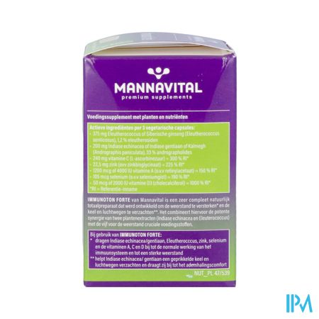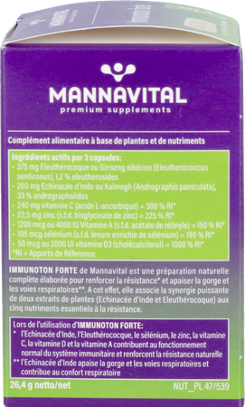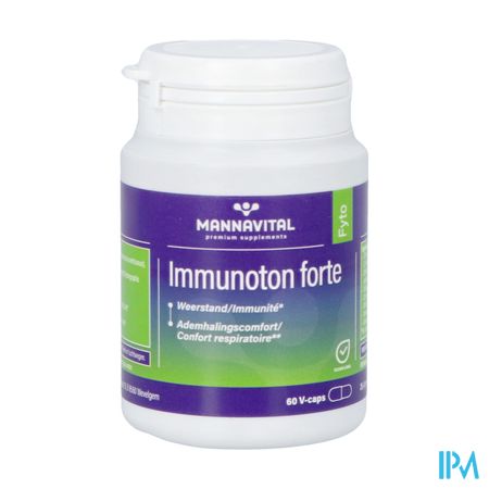 Mannavital Immunoton Forte V-caps 60 is een voedingssupplement, verkrijgbaar in uw buurtapotheek of online apotheek. Neem niet meer dan de aanbevolen dagelijkse dosis vermeld op de verpakking. Het vervangt geen gezonde levensstijl en gevarieerde en evenwichtige voeding. Vraag raad aan uw apotheker. Het product altijd buiten het bereik van kinderen houden.
