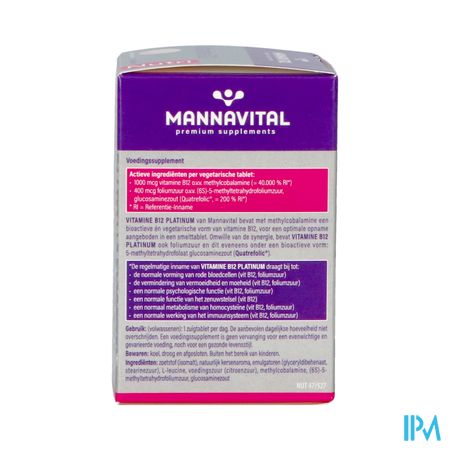 Mannavital Vitamine B12 Platinum V-tabl 60 Nf is een voedingssupplement, verkrijgbaar in uw buurtapotheek of online apotheek. Neem niet meer dan de aanbevolen dagelijkse dosis vermeld op de verpakking. Het vervangt geen gezonde levensstijl en gevarieerde en evenwichtige voeding. Vraag raad aan uw apotheker. Het product altijd buiten het bereik van kinderen houden.