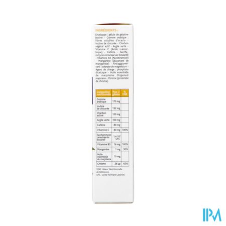 Envelop: Rundergelatinecapsule – Arabische gom: oplosbare acaciavezel – Cichorei-inuline – Geactiveerde plantaardige kool – Groene klei – Vitamine C (L-ascorbinezuur) – Cafeïne – Saccharomyces cerevisiae var. boulardii – Vitamine B3 (Nicotinamide) – Mangaan (mangaangluconaat) – Antiklontermiddel: magnesiumstearaat – Vulstof: dicalciumfosfaat – Etherische olie van marjolein Origanum majorana – Chroom (chroompicolinaat).