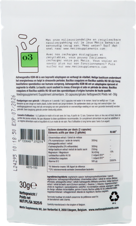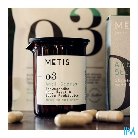 Metis Anti-Stress 03 is een effectief supplement op basis van Ashwaganda KSM-66® en Magnesium. Het draagt bij aan de normale weerstand tegen stress en ondersteunt de nachtrust.