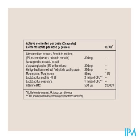 Citroenmelisse extract (Melissa officinalis); Ashwagandha extract (Withania somnifera); Heilige basilicum extract (Ocimum sanctum); Magnesiumcitraat; Cyanocobalamine; vegetarische capsule: hydroxypropylmethylcellulose; vulstoffen: microkristallijne cellulose, acaciagom; Bacillus subtilis Hu 58; antiklontermiddel: magnesiumstearaat; Bacillus coagulans