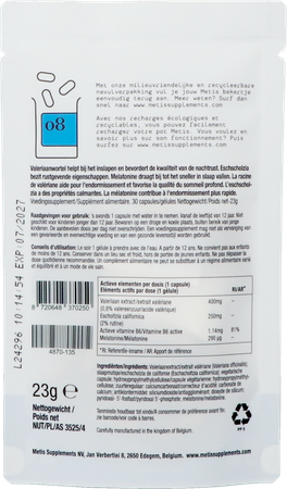 Metis Sleep 08 Eco Refill Caps 30 is een voedingssupplement, verkrijgbaar in uw buurtapotheek of online apotheek. Neem niet meer dan de aanbevolen dagelijkse dosis vermeld op de verpakking. Het vervangt geen gezonde levensstijl en gevarieerde en evenwichtige voeding. Vraag raad aan uw apotheker. Het product altijd buiten het bereik van kinderen houden.