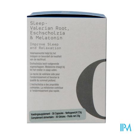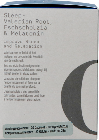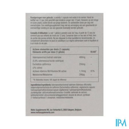 Ingrediënten: valeriaanextract: valeriana officinalis, eschscholzia, vitamine B6: Pyridoxal-5'-fosfaat, vegetarische capsule: hydroxypropylmethylcellulose, zuurteregelaar: calciumcarbonaat, anitklontermiddel: siliciumdioxide, melatonine