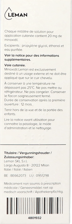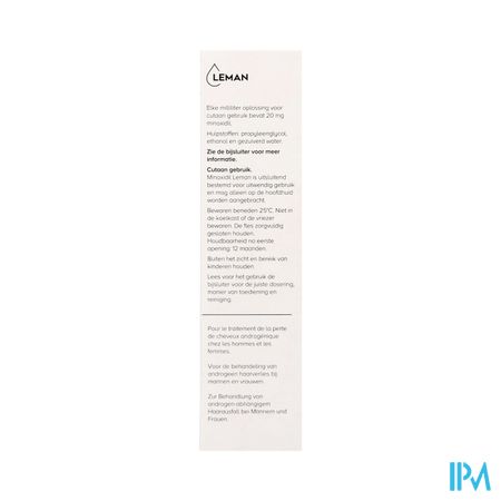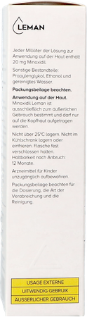 Minoxidil Leman is een oplossing voor gebruik op de huid die de werkzame stof minoxidil bevat voor de behandeling van klachten van haarverlies als gevolg van mannelijke hormonen (androgeen haarverlies) bij mannen en vrouwen tussen 18 en 55 jaar oud.