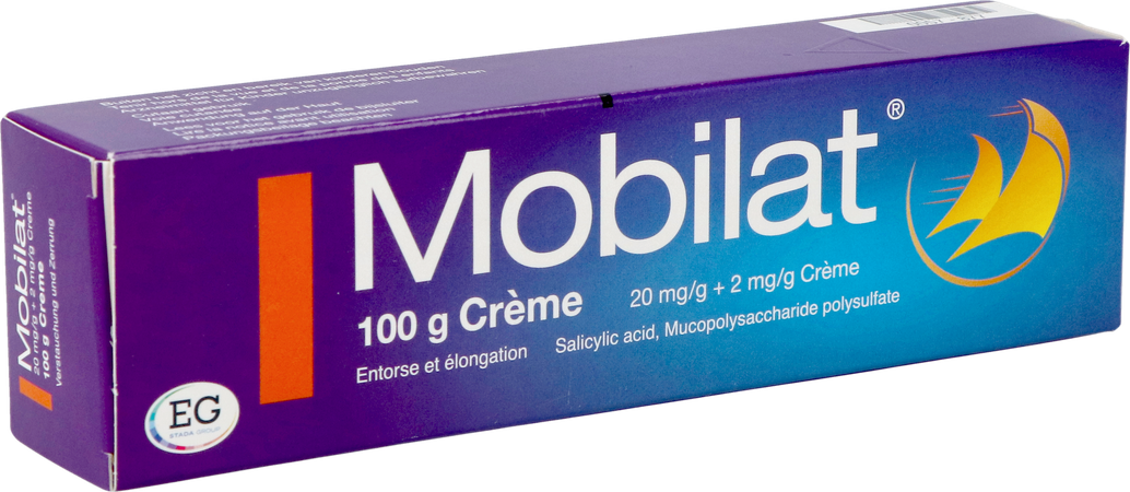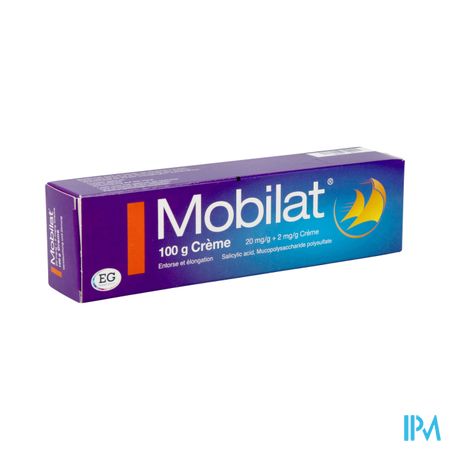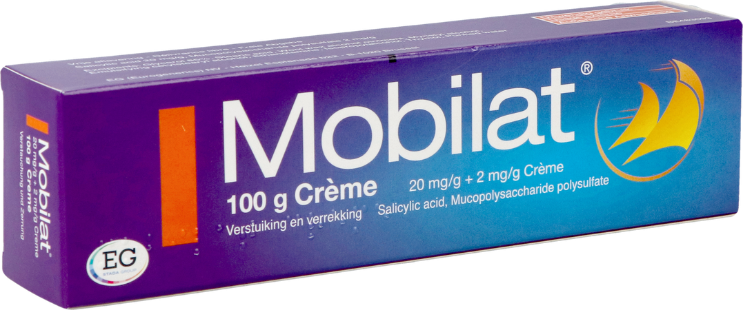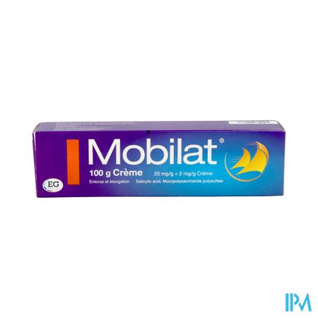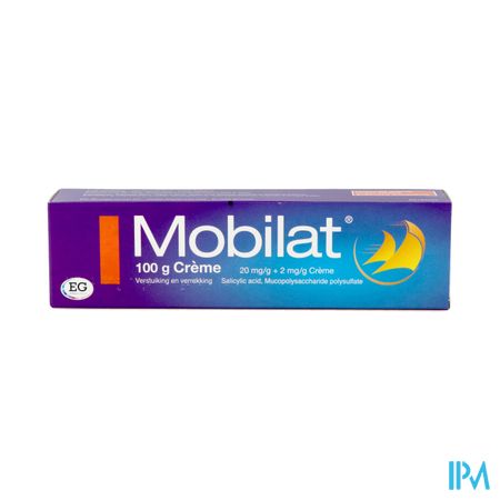 Welke stoffen zitten er in Mobilat crème / Mobilat gel ? Mobilat crème:  De werkzame stoffen in Mobilat crème zijn salicylzuur (20 mg per gram crème) en mucopolysacharidepolysulfaat (2 mg per gram crème).  De andere stoffen in Mobilat crème zijn: 85 %-ig glycerol, stearinezuur, wolalcoholbalsem, myristylalcohol, emulgerend ketylstearylalcohol (type A), ethanolamine, isopropylalcohol, thymol, gezuiverd water.