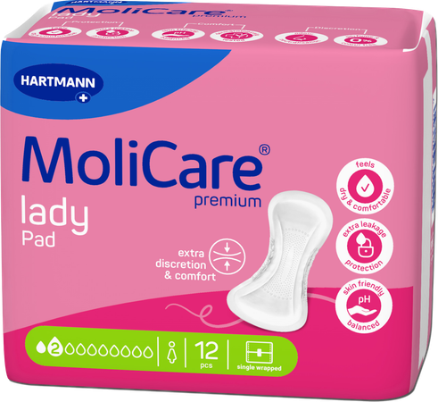 MoliCare® premium lady Pad 2 druppels zijn incontinentieverbanden voor vrouwen met een lichte blaaszwakte. De gepatenteerde absorberende kern neutraliseert geurtjes en helpt de huid gezond te houden.