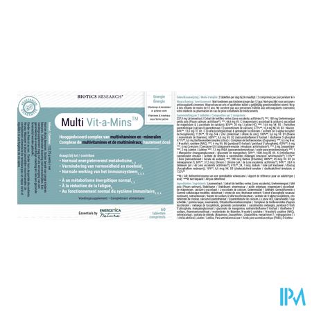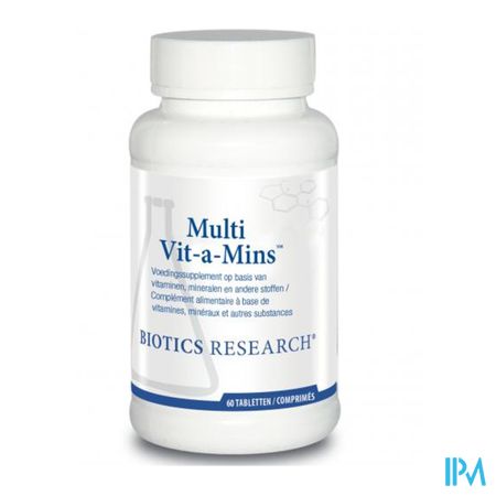 Multi Vit-a-mins Tabl 60 is een voedingssupplement, verkrijgbaar in uw buurtapotheek of online apotheek. Neem niet meer dan de aanbevolen dagelijkse dosis vermeld op de verpakking. Het vervangt geen gezonde levensstijl en gevarieerde en evenwichtige voeding. Vraag raad aan uw apotheker. Het product altijd buiten het bereik van kinderen houden.