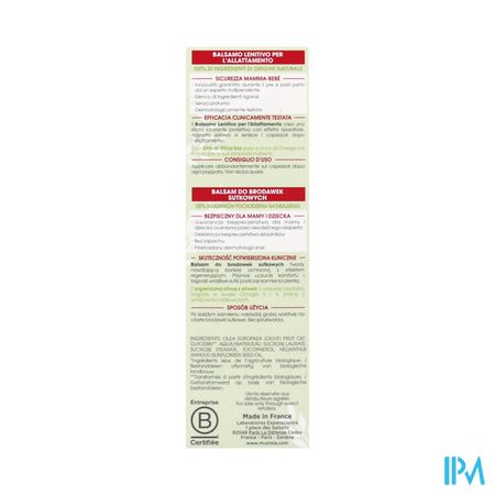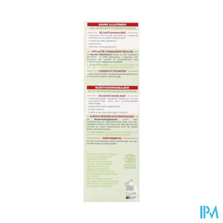 Compatibel met borstvoeding, met inachtneming van de hygiënevoorschriften voor borstvoeding. De formule van de Balsem is vegan - zonder ingrediënten van dierlijke oorsprong - en zonder parfum. Deze verzorging bestaat uit 100% ingrediënten van natuurlijke oorsprong.