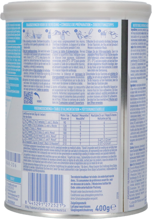Glucosestroop, zonnebloemolie met hoog oliezuurgehalte, weipoeder, koolzaadolie met laag erucazuurgehalte, kaliumcaseïnaat, maltodextrine, zonnebloemolie, calciumcitraat, kaliumchloride, emulgator: sojalecithine; natriumfosfaat, cholinebitartraat, olie van de microalg Schizochytrium sp, olie van mortierelle alpina, natriumcitraat, L-fenylalanine, vitamines (C, E, niacine, pantotheenzuur, B1, A, B2, B6, foliumzuur, K, D, biotine, B12), magnesiumoxide, L reuteri*, L-histidine, kaliumcitraat, zuurteregelaar: citroenzuur; taurine, L-tryptofaan, ijzersulfaat, inositol, L-carnitine, zinksulfaat, nucleotiden, kopersulfaat, mangaansulfaat, kaliumjodide, natriumselenaat.